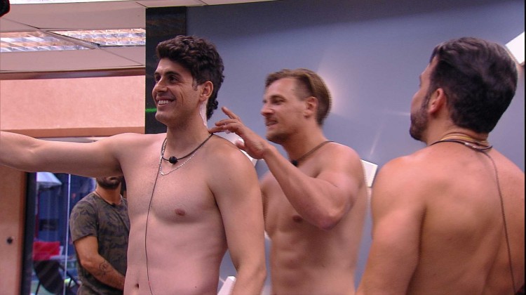 Com o corte feito por Gustavo, Maycon está de visual novo. Quem ajudou na finalização foi Diego, que foi alertado pelo mineiro: "Cuidado". O brother usa lâminas para finalizar e tem como plateia Vinicius e Gustavo.