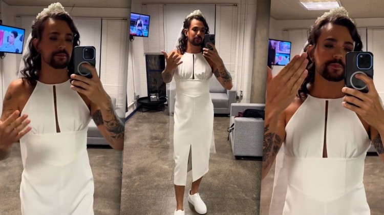 De vestido branco e véu, Vítor diCastro brinca sobre Vinícius: 'Pronto para encontrar meu noivo'